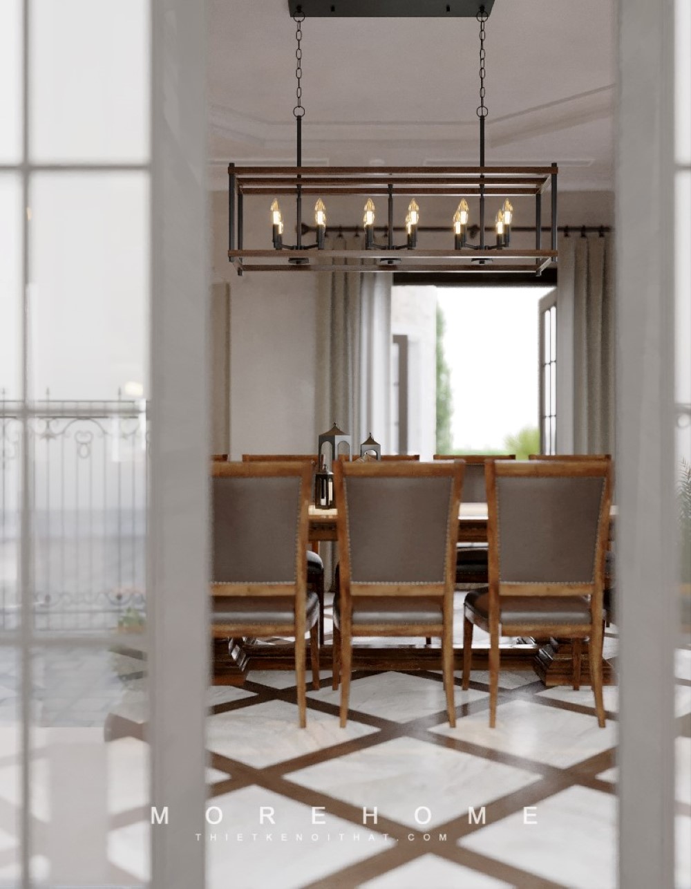 Trang trí phòng ăn đơn giản với thiết kế tranh treo tường họa tiết nhẹ nhàng và đèn chùm thả trần là điểm nhấn cho căn phòng