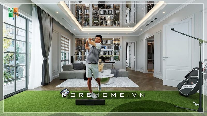 Một ý tưởng thiết kế mới độc đáo đầy sáng tạo cho phòng khách biệt thự, nhà phố hiện đại với sofa vải dáng góc đơn giản và bố trí sân chơi golf nhỏ ấn tượng.