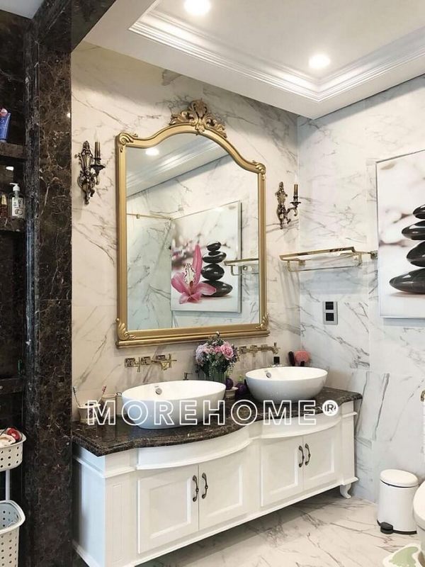 Đây là hình ảnh thực tế của Morehome khi thực hiện việc treo gương trên tường phòng tắm, mang lại phong cách tân cổ điển sang trọng.