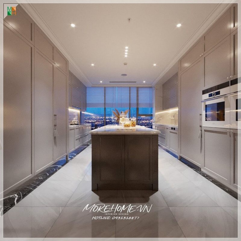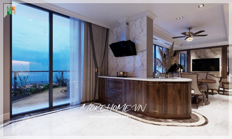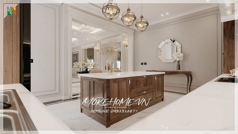 Phòng bếp được thiết kế với bàn đảo bằng gỗ óc chó màu nâu trầm tự nhiên kết hợp với mặt đá nhân tạo màu trắng, phù hợp với các căn hộ, nhà phố, biệt thự có phong cách tân cổ điển.