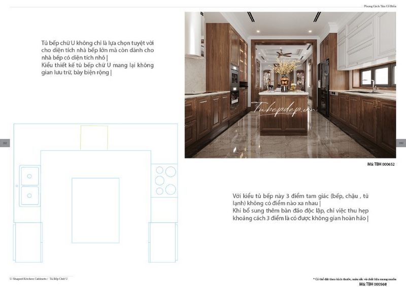 Thiết kế phòng bếp trong không gian mở với sự sử dụng của gỗ óc chó theo phong cách tân cổ điển màu nâu đẳng cấp sẽ làm nổi bật vẻ đẹp của biệt thự, nhà phố, chung cư cao cấp.